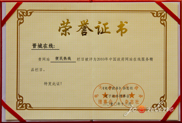 近年來,“晉城在線”已成為山西省內(nèi)外知名的信息站點(diǎn),先后獲得了“中國(guó)城市門戶網(wǎng)站十大公信品牌”、“2008年中國(guó)政府門戶網(wǎng)站優(yōu)秀獎(jiǎng)”、“2009年中國(guó)政府門戶網(wǎng)站優(yōu)秀獎(jiǎng)”、“中國(guó)優(yōu)秀誠(chéng)信品牌”、““2008年中國(guó)政府門戶網(wǎng)站信息公開領(lǐng)先獎(jiǎng)”、“全國(guó)地方門戶網(wǎng)站十佳品牌”、“全國(guó)地方網(wǎng)站最具創(chuàng)新發(fā)展?jié)摿ζ放啤薄ⅰ?010年中國(guó)政府網(wǎng)站領(lǐng)先獎(jiǎng)”等諸多榮譽(yù)稱號(hào)。